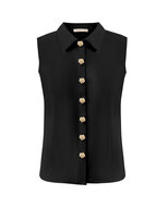 Een nieuwe blouse in de collectie van Triple Nine. De mouwloze blouse heeft een kraag met prachtige gouden knopen