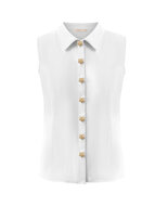 Een nieuwe blouse in de collectie van Triple Nine. De mouwloze blouse heeft een kraag met prachtige gouden knopen