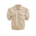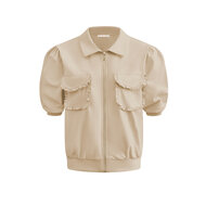 Kort jasje in travelstof met goudkleurige rits. De jas heeft een opstaande kraag en heeft steekzakken. Het leuke is dat de rits ook van onder af open kan zodat naar keuze de details van de band van ee