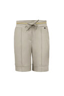 De stevige Travelstof voelt aan als een tweede huid en zorgt ervoor dat je figuur prachtig wordt geaccentueerd. De broek sluit perfect aan bij de heupen en billen, terwijl de korte pijpen recht uitlopen tot halverwege het bovenbeen met omslag. De elastische tailleband met gouden bies en trekkoord draagt bij aan het comfort, en de steekzakken aan de voorkant en zakken aan de achterkant geven de broek een stijlvolle en praktische uitstraling. Ook brengt de naad op het voorpand een optisch slank effect.