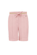 De stevige Travelstof voelt aan als een tweede huid en zorgt ervoor dat je figuur prachtig wordt geaccentueerd. De broek sluit perfect aan bij de heupen en billen, terwijl de korte pijpen recht uitlopen tot halverwege het bovenbeen met omslag. De elastische tailleband met gouden bies en trekkoord draagt bij aan het comfort, en de steekzakken aan de voorkant en zakken aan de achterkant geven de broek een stijlvolle en praktische uitstraling. Ook brengt de naad op het voorpand een optisch slank effect.