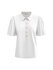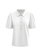Een top van travelstof ronde hals welke open is te knopen als v-hals met de goudkleurige knopen. De travel top heeft korte mouwen en vallen soepel los.Â
