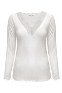 Een nieuw model in de collectie van Triple Nine. Een top met lange mouwen en een V-hals met een kante afwerking. De stof is heerlijk dun en zacht.
